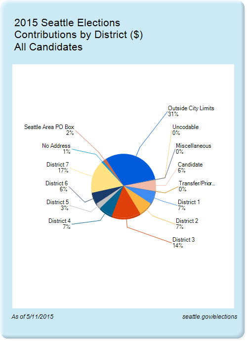 Roderick, for comparison, brought in $53,152 this month (his first month of fundraising), for a total of $55,585, and $38,921 on hand. Of that total, he owes $5,707, mostly for fundraising and consulting. A whopping 59 percent of his money so far comes from outside Seattle, with the next-highest percentage, 11 percent, from Capitol Hill’s District 3.